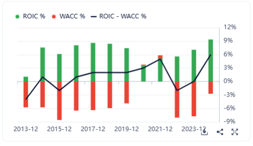 Il ricavato serve soprattutto a rifinanziare debito a condizioni migliori, non perché siano in affanno: è un uso del debito abbastanza ordinato. A livello di bilancio 2024 l’azione Maire (SIMBOLO MAIRE) ha una buona situazione patrimoniale con un indicatore sintetico Piotroski di 7 su 9 e un interest coverage di 10.88, un cash to debt di 1,73 anche se il debt to equity è di 1.11. A livello reddituale abbiamo un margine operativo lordo sul fatturato del 6,52% e un ROIC – WACC che vale la pena di essere mostrato perché sicuramente tranquillizzante per un industriale: