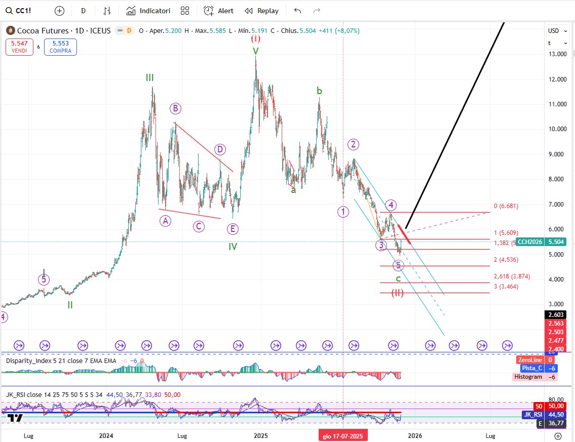 La scorsa settimana avevo indicato come target finale di onda [5] la zona attorno ai 4536$. Quello era il target di massima determinato dal 200% di onda [4]. Poi sappiamo che i target più frequenti delle quinte onde sono due: il 138,2% e il 200% della quarta precedente. In effetti il supporto del 138,2% è stato sentito e superato ma venerdì con un colpo di reni il cacao non solo si è riportato sopra al supporto del 138,2%, ma è andato a ritestare da sotto il minimo della precedente onda [3]. A questo punto dobbiamo vedere come procede la settimana prossima. Se supera anche il minimo di onda [3] e si porta fuori dal canale di trend discendente, allora possiamo essere abbastanza ottimisti per dire che l’onda (III) di superciclo è iniziata e che i prezzi continueranno a salire per molti mesi. Se al contrario i prezzi tornano a scendere portandosi nuovamente sotto al livello del 138,2% allora vorrà dire che l’onda [5] non era finita e il target finale torna ad essere quello indiato la settimana scorsa a 4.536$. Si faccia poi attenzione al fatto che il rimbalzo in atto dovrebbe essere la (4) di [5] per cui i prezzi potrebbero uscire dal canale di trend di poco senza invadere il territorio di onda (1). Non sto a postarvi anche il grafico a 2 ore, ma se ve lo andate a vedere, il cinque onde ribassista è netto e inconfondibile e il minimo di onda (1) è a 5986$. Quindi per stare dalla parte dei bottoni diciamo che saremo rialzisti al superamento di quota 6000$ e non parliamo più. Poi siccome questa sarà l’onda 1 del nuovo ciclo se vogliamo evitare di beccarci l’onda 2 aspetteremo di vedere lo sfondamento di quota 6000 e un successivo ritracciamento. Ne riparleremo al momento giusto.
