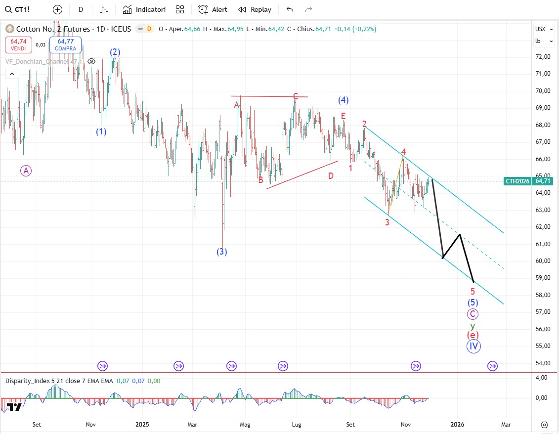 Sul Cotone si sta modellando l’onda 5 di (5), che chiuderà tutti i livelli superiori fino all [IV} di gran super ciclo. Le onda [i] e [ii] sono ormai formate mentre le onde [iii], [iv] e [v] sono stimate con le estensioni e i ritracciamenti di Fibonacci.