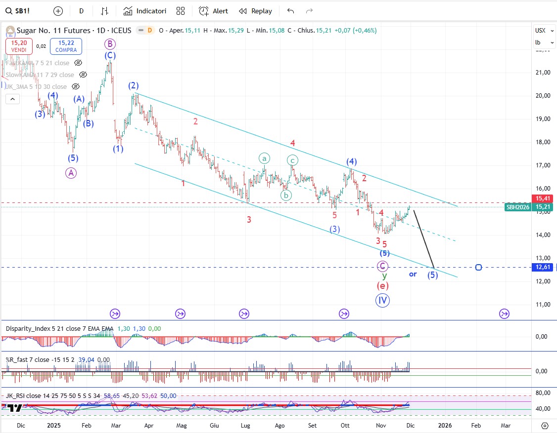 Lo zucchero tecnicamente ha completato l’onda [IV] di gran super ciclo ed ora dovremmo essere sulla [V] di gran super ciclo tuttavia per poter essere certi che l’attuale gamba rialzista non sia in realtà la 4 di (5) bisogna che i prezzi salgano ancora un pizzico per andare a invadere il territorio di onda 1 che ho evidenziato con la linea tratteggiata rossa. Se questo accade allora saremo certi che non può essere l’onda 4 di(5) e il conteggio attuale sarà confermato. Se invece la prossima settimana i prezzi dovessero ripiegare nuovamente verso il basso allora aumenteranno le probabilità che l’onda (5) non sia ancora finita.
