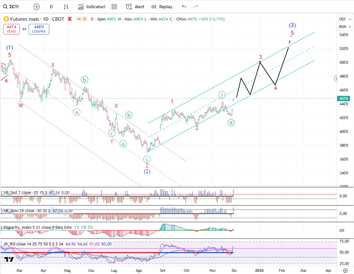 Come dicevo la settimana scorsa se l’onda se l’onda [ii] è terminata i prezzi saliranno già nella prossima settimana. In realtà Il mais nelle prime sedute ha perfezionato il minimo di onda [ii] scendendo ancora seppur di poco, ma poi nelle sedute di giovedì e venerdì i prezzi sono schizzati in alto andando a chiudere nettamente sopra al massimo di onda [i]. Il seguito del film dovrebbe seguire grosso modo il modello che ho disegnato con le estensioni e i ritracciamenti di Fibonacci.