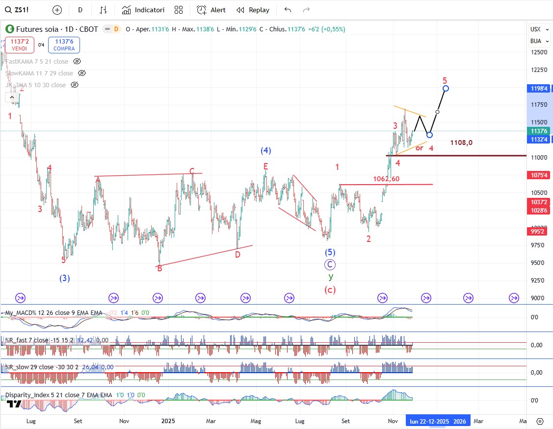 La soia sembra voler sviluppare un triangolo per l’onda 4. Non possiamo ancora esserne certi ma l’idea sembra essere questa. La successiva onda 5 dovrebbe spingere la soia verso quota 12000. Trading view espone il prezzo in millesimi senza punti di separazione sui decimali. Al CBOT invece i prezzi esprimono centesimi di $ per bushel quindi sarebbero 1200,0 c quindi 12$/bushel. Approfitto per ricordare che il bushel è un contenitore standard che contiene circa 35 litri (35,24). Ma il peso varia in base alla densità e anche all’umidità del cereale che ci si mette dentro. Se riempiamo un bushel di avena che è un cereale molto leggero ci staranno 32 libre (14,5 Kg). Se mettiamo mais che pesa di più un bushel conterrà 56 libre (25,4Kg). Se mettiamo Soia o Grano un bushel conterrà 60 libbre (27,2)Kg. I contratti sui grani trattano 5000 bushel per contratto.