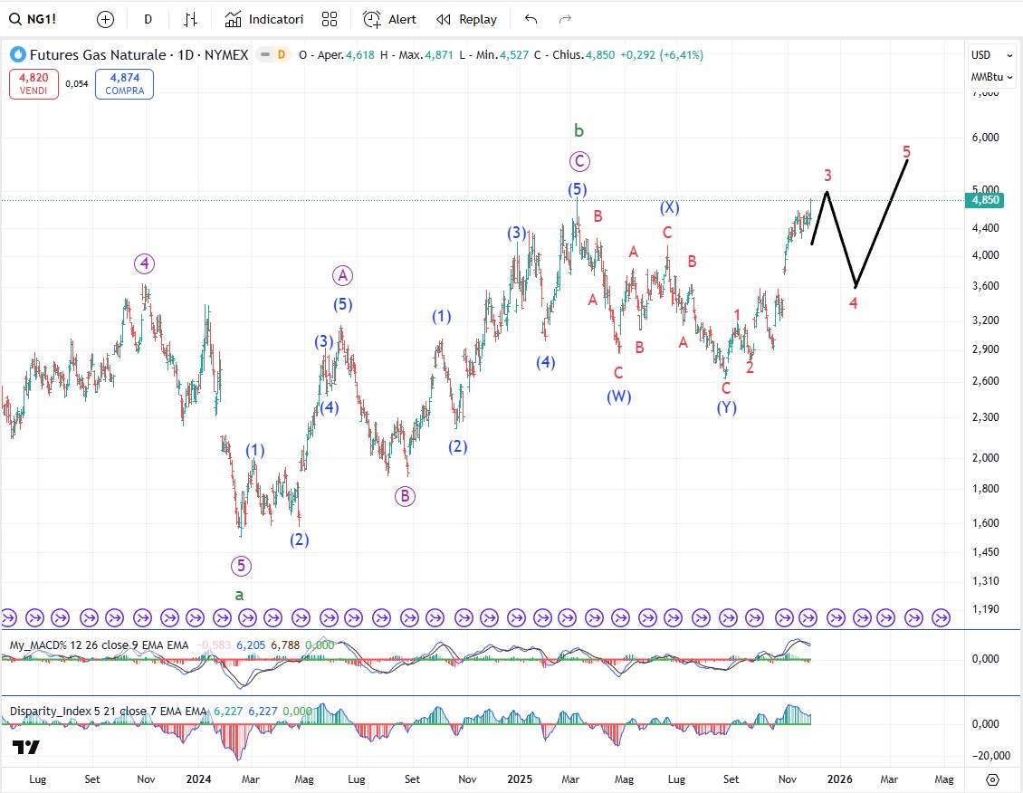 Bene il gas naturale che stanno avvicinandosi al primo target che è la fine di onda 3. Seguirà poi una correzione ma la successiva onda 5 porterà i prezzi ancora più in alto.