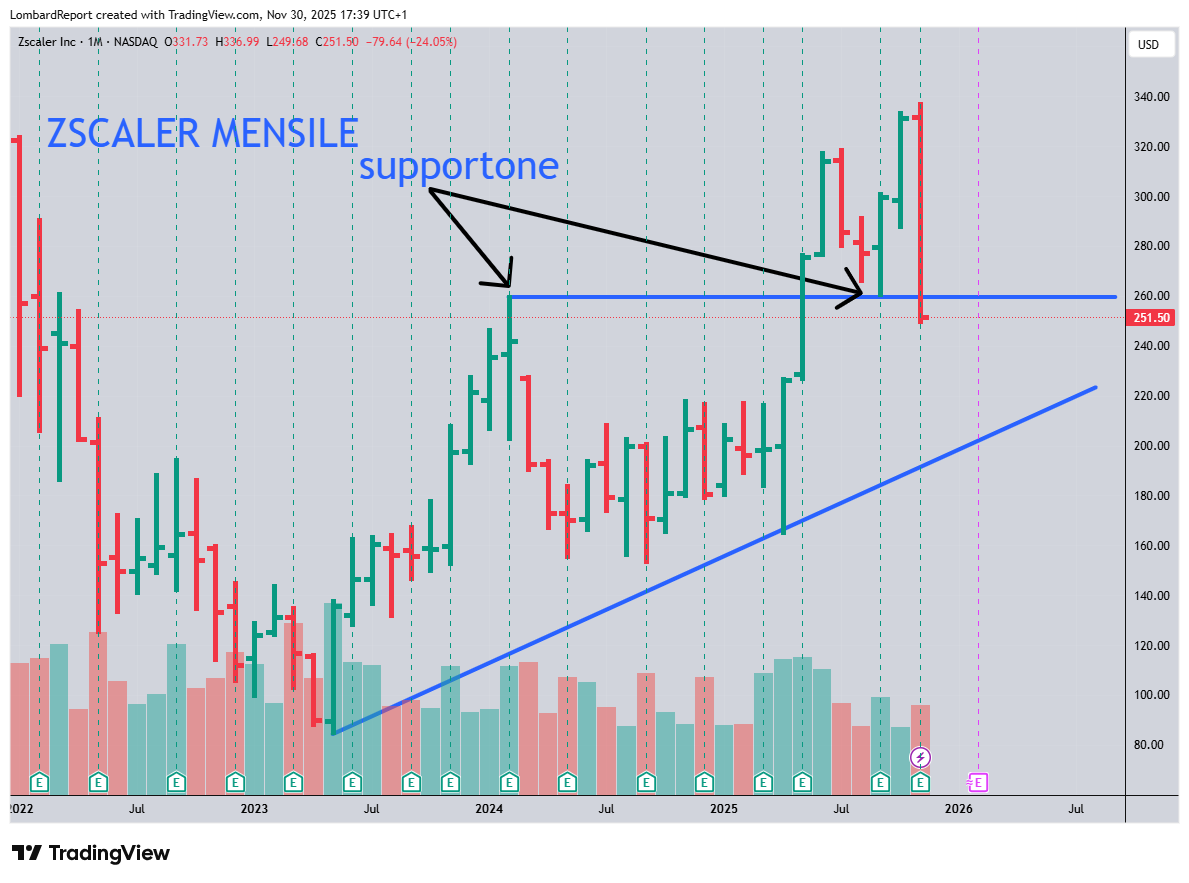 Le azioni Zscaler (ZS) sono scese di quasi il 20 % dal 25 novembre a venerdì scorso dopo che i risultati del terzo trimestre dell’azienda hanno mostrato un calo negli ordinativi futuri, che ha fatto dimenticare al mercato un trimestre altrimenti impressionante con numeri da urlo. La società di sicurezza cloud ha riportato ricavi per 788,1 milioni di dollari, in aumento del 25,5% su base annua, e un utile rettificato di 0,96 dollari per azione, entrambi superiori alle aspettative degli analisti. Zscaler ha inoltre rivisto al rialzo la sua guidance annuale per ricavi e utili. Ma siccome gli ordinativi sono in calo il mercato ha visto il bicchiere mezzo vuoto.
