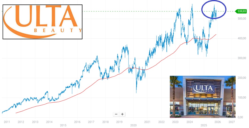 La reazione degli investitori è energica: il titolo rompe area $ 530, un livello che per anni aveva respinto ULTA BEAUTY, e tocca nuovi massimi oltre $ 550.
