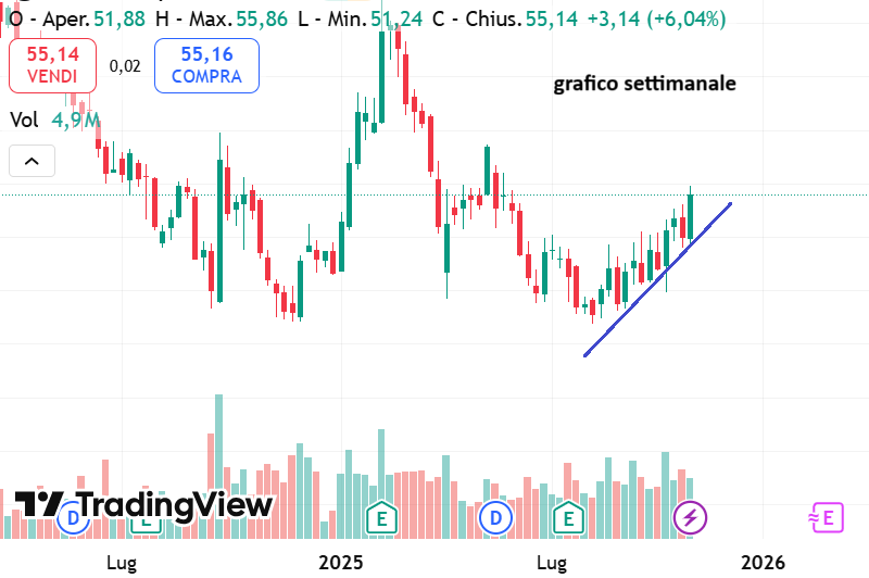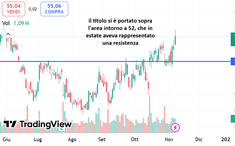 Tra una correzione e l’altra, il titolo risulta essere in una fase rialzista da metà agosto. Recentemente, inoltre Moncler si è portata sopra l’area 52 che in estate aveva rappresentato una resistenza. Dopo alcuni tentativi di superamento di questa resistenza, ora il titolo sembra aver messo la testa sopra questo livello. Oggi l’azione ha toccato un massimo di 55,86, quotazione più elevata da maggio 2025.