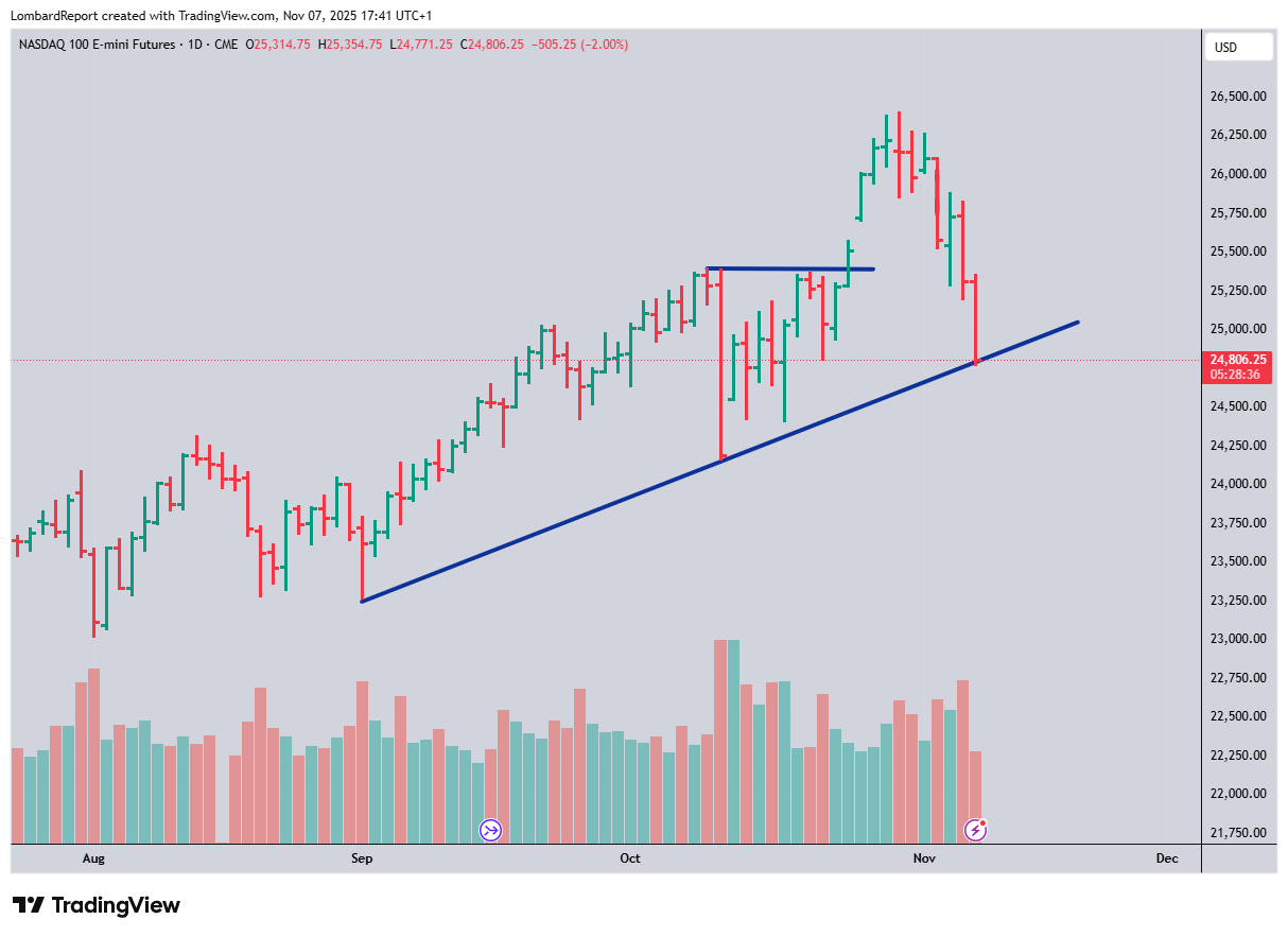 Lo so che prendere stop loss non è bello ma diciamo che il mercato rimane ancora impostato positivamente. Con gli indici USA siamo ancora sopra la trendline di breve periodo che corre poco sotto di noi e pubblico il grafico del Nasdaq futures: