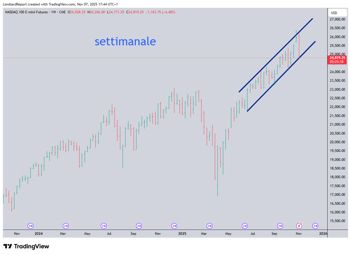 Qualora dovessimo vedere la rottura della trendline del Nasdaq (e degli altri indici USA) potremmo cambiare idea in fretta: del resto un vecchio trader incontrato 3 decenni fa soleva raccontare che per rasserenare gli animi sull’eventualità di un ribasso durante il rialzo basta guardare il grafico su scala settimanale e non su scala giornaliera. E se lo facciamo vediamo che siamo in un trend al rialzo:
