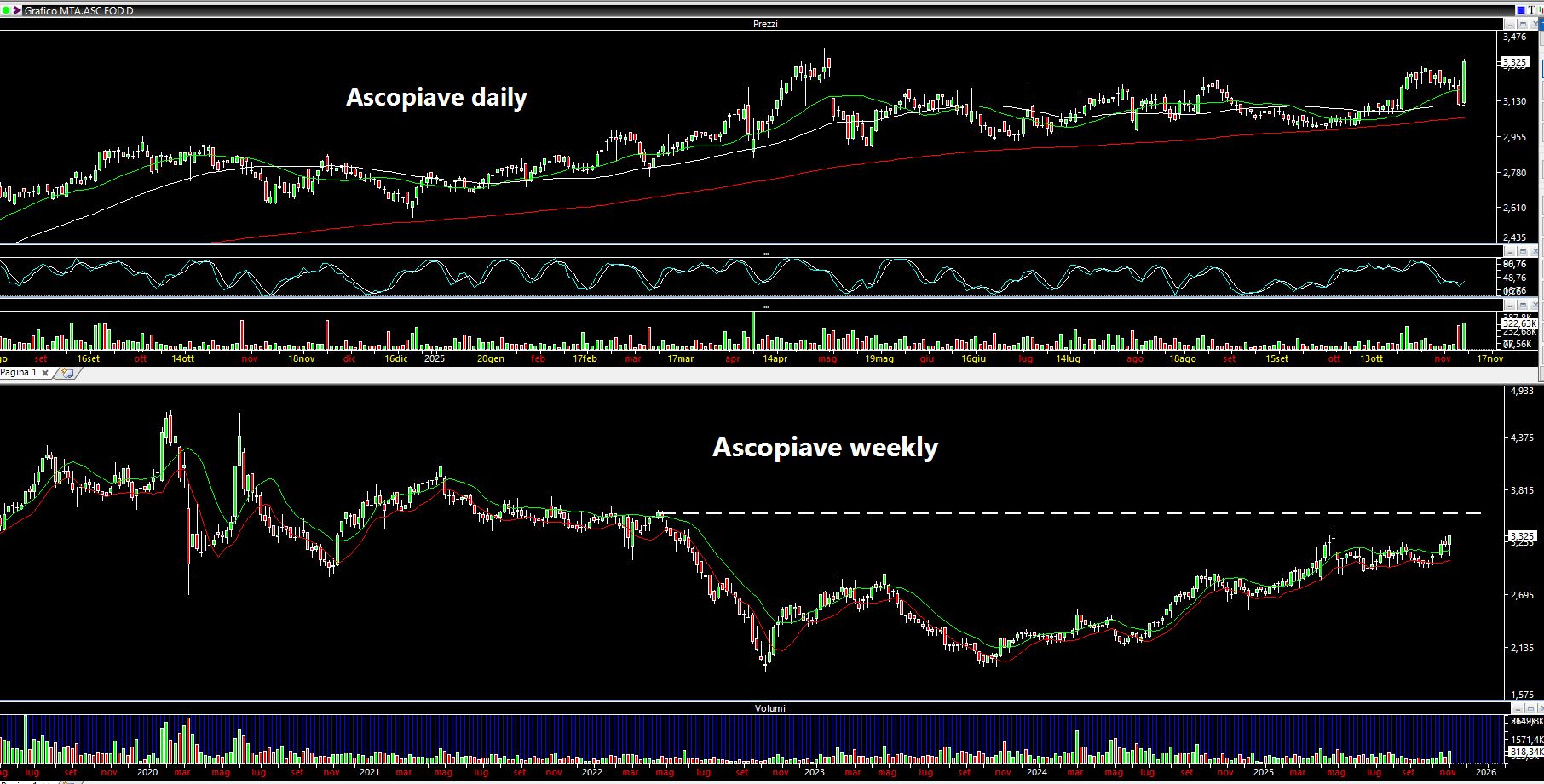 Azione SOTTILE, quindi ad ognuno il proprio trading plan. Anche in questo caso, come per Lottomatica, DeNora etc..giovedì sono usciti i risultati e sono stati presi male poi per magia il giorno dopo l'azione ha segnato +7% con volumi maggiori. Azione sottile significa che ci possono essere spike in un verso o nell'altro. Impostata bene sia sul daily che sul weekly, finché riuscirà a mantenersi sopra l'area 3,15-3,20. Una possibile calamita dei prezzi potrebbe essere attorno a 3,57 euro (linea tratteggiata sul grafico settimanale).