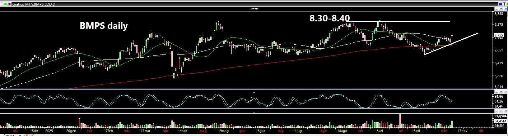 Conti molto buoni pubblicati venerdì: nei primi nove mesi il margine di intermediazione primario è stato pari a 2.82 miliardi di euro rispetto ai 2.86 dell'esercizio precedente. Margine di interesse in flessione del 7,4% a 1,64 miliardi di euro: una variazione dovuta alla riduzione dei tassi di interesse. Commissioni nette in salita dell'8.5%. a 1.19 miliardi. I ricavi complessivi sono saliti a 3.05 miliardi ed il risultato operativo netto ha fatto segnare +3.7% a 1.39 miliardi di euro. Non mi stupirebbe dovesse dirigersi nuovamente verso l'area 8,30-8,40 finché rimane sopra la trendline dinamica ascendente.