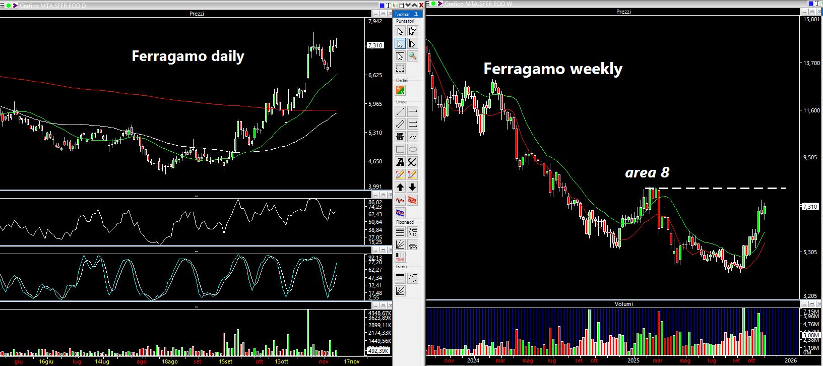 Mi piace molto il trend sul daily e sul settimanale. L'area 8 è una bella calamita. Sul grafico giornaliero al momento gli swing sono nell'ordine del 10-15%, ma sulla debolezza qualche acquisto ci può stare. Non è il titolo ideale per chi cerca un punto di ingresso e uno stop preciso. Al momento rimane da monitorare ma l'ho inserita in watchlist.