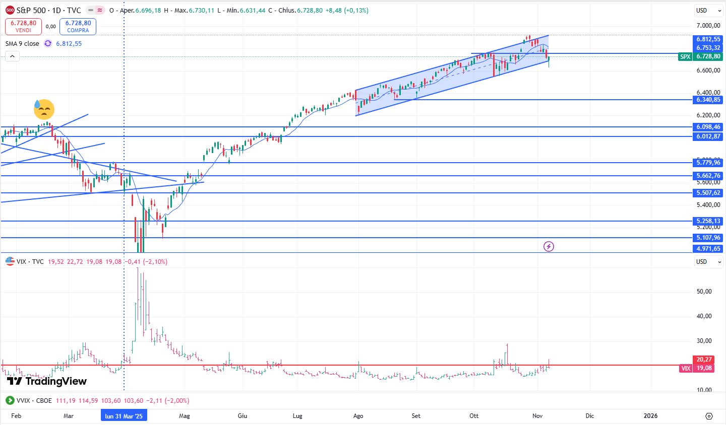 L'S&P500 ha testato prima il supporto statico in area 6753 e nella seduta di giovedì lo ha bucato, accentuando il ribasso venerdì ed andando a testare e a bucare la trendline dinamica ascendente del canale rialzista. C'è stato però un incredibile recupero nel finale di ottava che ha portato de facto a non bucare la trendline dinamica di supporto e quindi abbiamo chiuso con una sorta di hammer a 6728 punti. Sopra 6753 potrebbe tornare positività di breve. Anche la volatilità, dopo un piccolo spike iniziale sopra 20 (massimo a 22,72), si è riportata a 19,08...come a dire: c'è un po' di tensione ma poi rientra subito nei ranghi, almeno per il momento.
