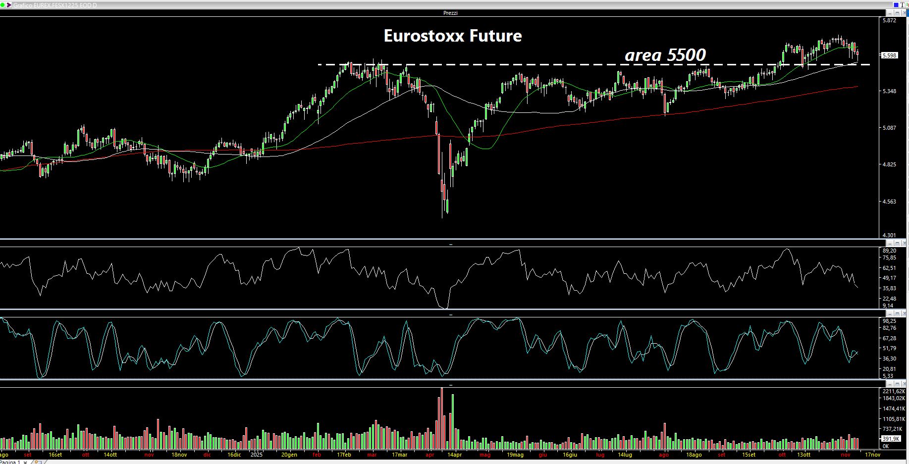 In Europa notiamo invece che tutte le Borse sono state al momento resilienti. L'Eurostoxx Future si sta lentamente avvicinando al supportone dei 5500 punti, con un minimo di venerdì a 5561. Al momento tuttavia i ribassi vengono in qualche modo riassorbiti e questo lo si nota dalle code delle candele nelle sedute di martedì, mercoledì e venerdì. Almeno per il momento naturalmente.