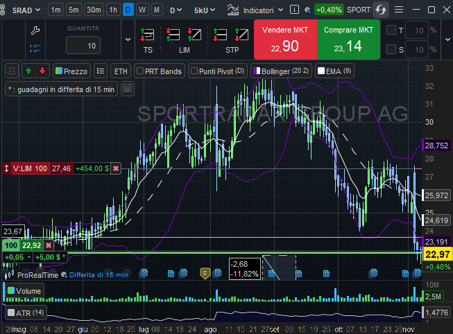 La prima è su SPORTRADAR GROUP (SRAD), che ha toccato i 22,50. Ha un punto di rimbalzo interessante. Ma attenzione al secondo livello, quello ai 19,80.