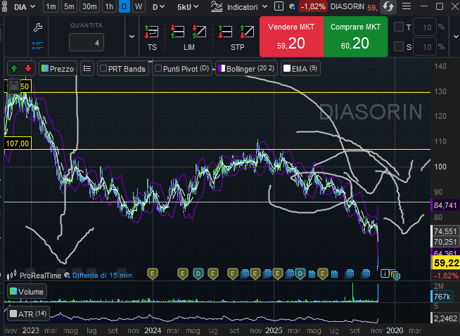 Il titolo navigava già in un percorso ribassista di correzione. E infatti, dal grafico, viene disegnato tutto questo con un’accelerazione al ribasso, semplicemente per squisite congetture tecniche. Per cui il titolo non riprenderà la sua corsa se non supererà un determinato recinto. È come trovarsi di fronte a una barriera montuosa e sapere che soltanto dall'altra parte esistono campi verdi, pascoli felici per il bestiame e terra fertile. Bene, finché non andiamo oltre quella barriera montuosa, dovremmo accontentarci di quello che passa il convento.