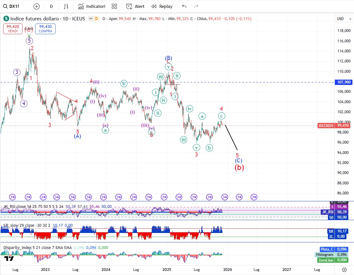 Il Dollar Index dovrebbe aver terminato l’onda 4 e se è così dovremmo vedere partire l’ultima gamba ribassista per il dollaro.
