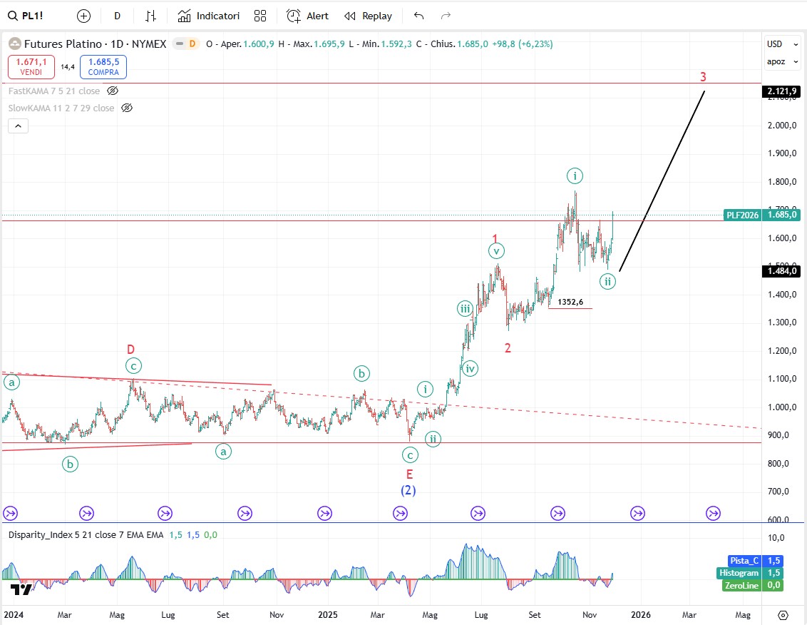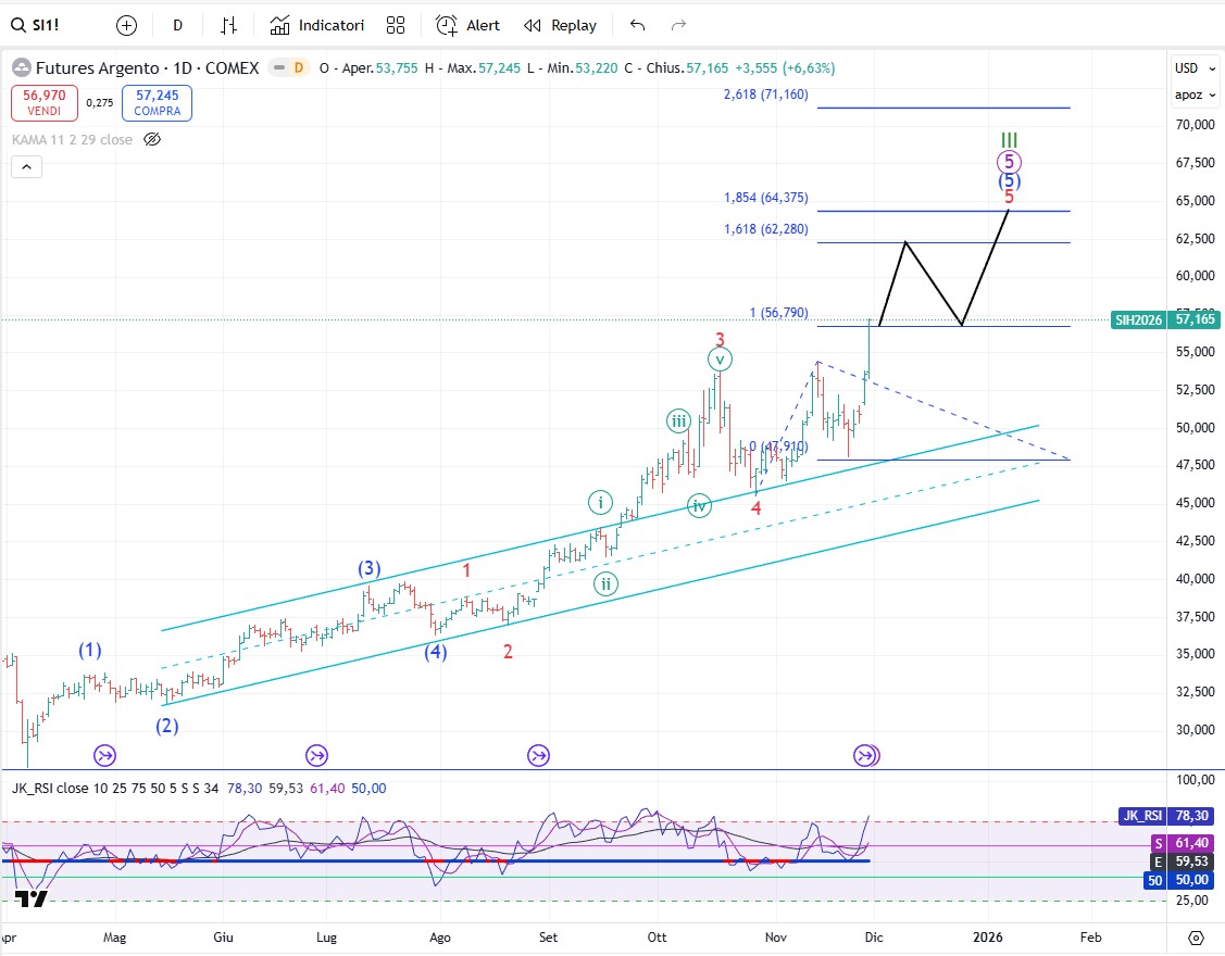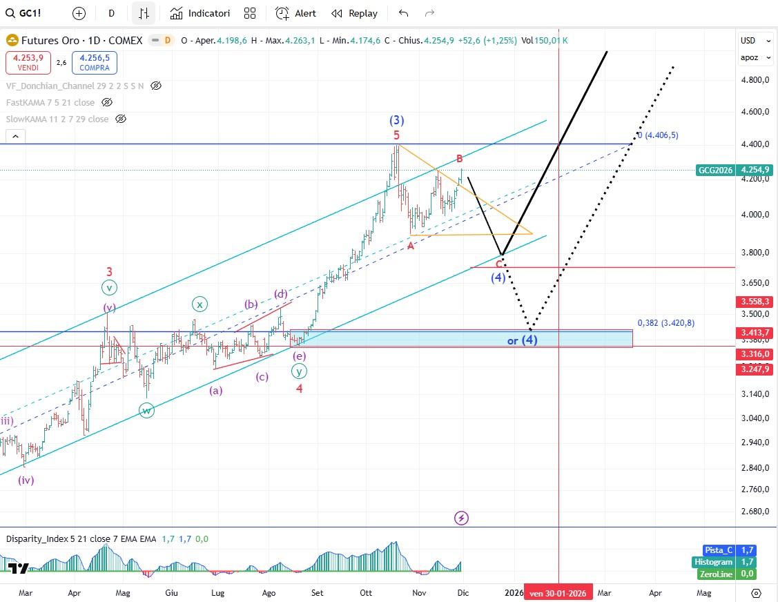 L’oro non sembra proprio aver voglia di scendere, anche se per ora il modello d’onda è ancora compatibile con un ABC correttivo classico di un’onda 4. Certo se i prezzi continueranno a salire allora è probabile che il modello attuale salti e che dobbiamo rivedere i conteggi.