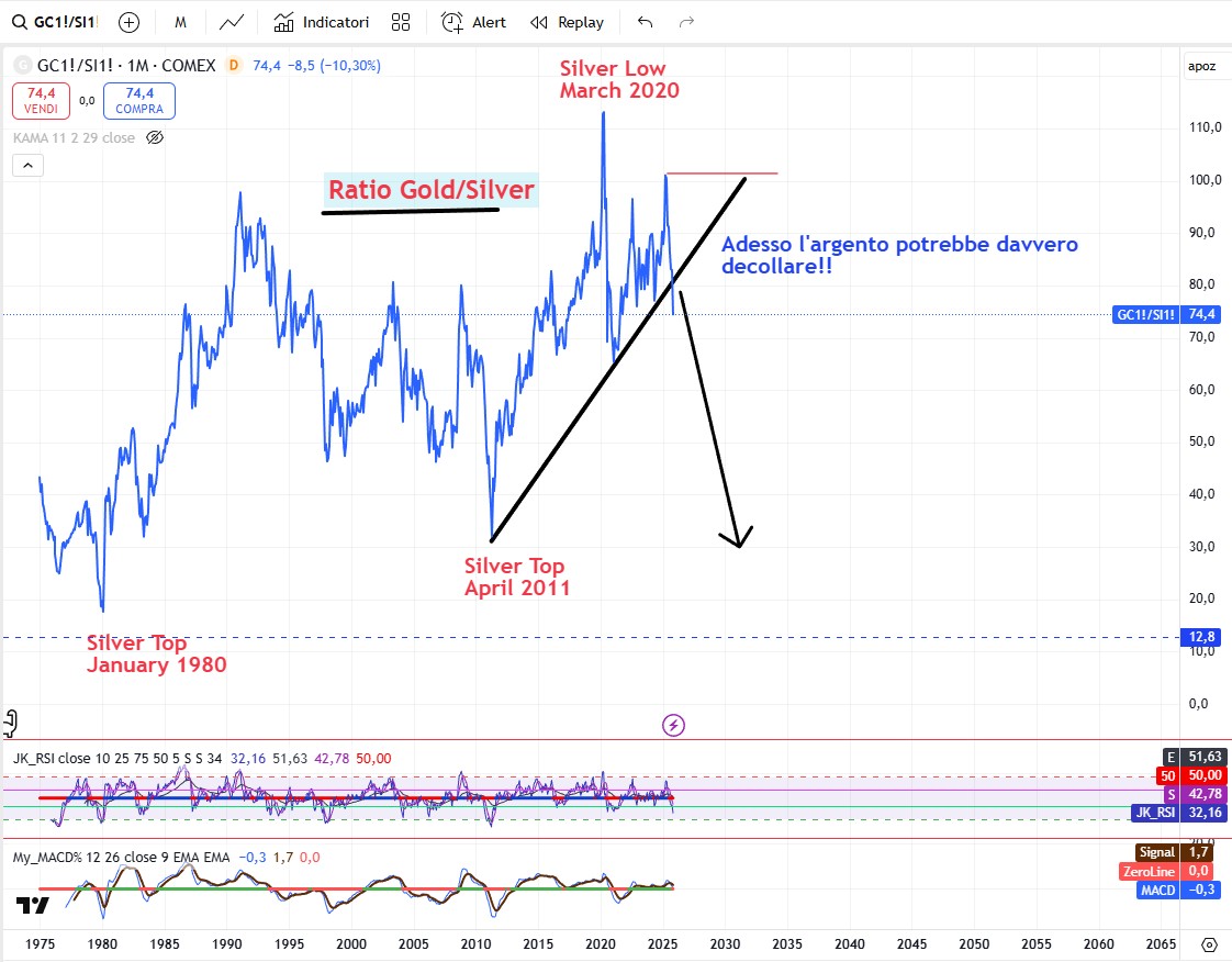 Ma la vera star del comparto, questa settimana è stato senza dubbio l’argento che chiude l’ottava con una barra rialzista mostruosa. Negli ultimi mesi ho segnalato più volte la maggior forza relativa dell’argento rispetto all’oro. La trendline che sosteneva il rialzo del rapporto oro su argento dopo alcuni tentativi riassorbiti questa settimana pare aver rotto definitivamente e se è così a questo punto la strada per portare l’argento a una quotazione a tre cifre è aperta! Sotto i due grafici.