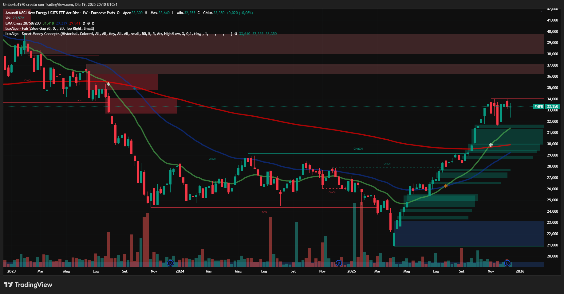 Nel “The Challenge”, tuttavia, abbiamo anche l’altro ETF sulle energie alternative : Amundi MSCI New Energy (ticker : ENER), analogamente protagonista di una bella risalita dalla scorsa primavera dopo aver rimbalzato dal precedente minimo allineato con quello registrato in epoca covid. E chiaramente l’attesa di una possibile virata verso auto con alimentazione a idrogeno non può non aver influito su tutto il comparto di aziende che questo strumento racchiude (alcune, tra l’altro, in comune con HTWO). La configurazione ci mostra una congestione nelle ultime settimane con importante resistenza in area 34. Anche qui la strada da percorrere è lunga e tortuosa, ma agevolata dal fatto di disporre al momento di un patrimonio in gestione sostanzialmente doppio rispetto ad HTWO, sebbene molto lontano dal picco conseguito nel corso del 2022 (1,57 B). Ma il mood sembra essersi modificato … anzi : è da un po’ che è cambiato ! Quando le aziende non si trovano costrette ad operare vincolate da lacci e lacciuoli che la politica spesso e volentieri pone loro davanti, allora – di norma – possono operare e performare in base alle loro capacità e portare proficui tornaconti agli inestitori.
