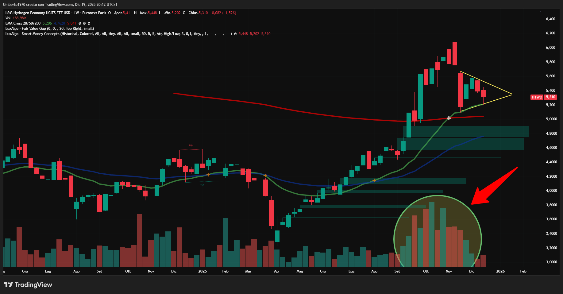 La fredda analisi ci dice che dal nostro ingresso vi era stato un leggero apprezzamento verso fine 2021, durato purtroppo lo spazio di un mattino. Da lì un inesorabile declino tra alti e bassi costantemente decrescenti fino a giungere al punto di minimo ad inizio aprile di quest’anno. E’ dalla primavera, infatti, che la mozione della neutralità tecnologica è stata sorretta con sempre maggior vigoria; ed è da allora che HTWO ha iniziato a risalire con quella pendenza a 45° a noi tanto cara, passando dagli inferi dei 3,228 al massimo dello scorso novembre pari a 6,19 con esplosione dei volumi. Indi, come si vede dal grafico weekly (è sempre bene valutare gli ETF su base settimanale), abbiamo avuto un salutare ritracciamento e un doppio rimbalzo sulla media mobile a 20 periodi dopo aver scavallato quella a 200, indice di ritrovata forza e vigore. Nelle ultime settimane sta poi costruendo un triangolo di congestione piuttosto intrigante, sebbene le contrattazioni si siano affievolite notevolmente (ma tutta la borsa di questi tempi si è fatta attendista e con il fiato corto …).
