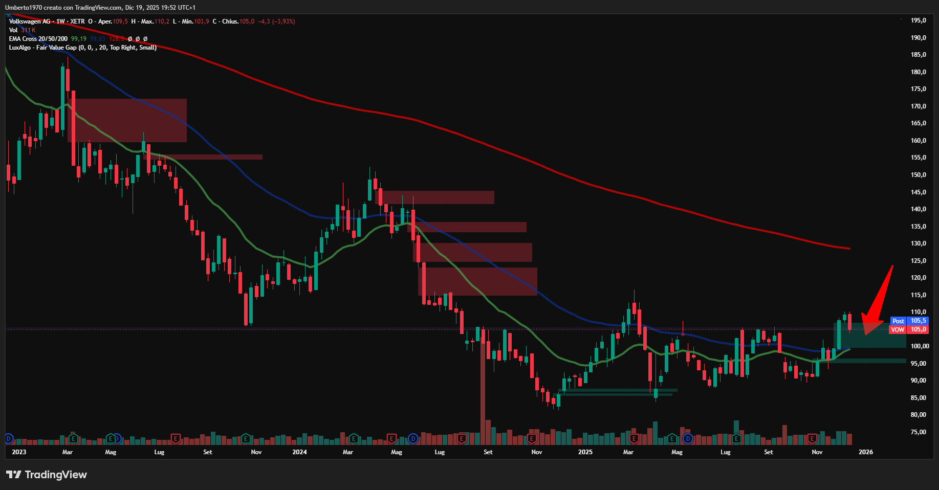 Questo per quanto riguarda gli ETF. Ma nel “The Challenge” ci sono anche delle società costruttrici d’auto che subiranno gli impatti di questa tardiva decisione di paziale ravvedimento : Ferrari, Stellantis e Volkswagen. Di Ferrari ve ne ha parlato tanto Fabio Tanevini (oggi intanto ha chiuso il gap apertosi il 10/12) e su Stellantis ancora oggi Emilio Tomasini ve ne dava riscontro nel nuovo video che trovate sul canale YouTube del Lombard. Quindi chiudo con due parole sull’azienda tedesca, la più bastonata in assoluto anche a causa di scelte forse prese con fin troppo entusiasmo. Inserita in portafoglio ormai due anni or sono, tra alti e bassi, in un percorso comunque che sembra sempre di più un triste declino dai fasti di un tempo e in una congestione tra gli 80 e i 110 euro in cui si barcamena da oltre un anno, potrebbe tornare titolo di interesse nel corso del 2026. L’ostacolo più duro rimane la resistenza sul settimanale in area 116 e, successivamente, la media mobile a 200 periodi, media di cui più volte vi ho ricordato l’importanza. Anche qui la strada al target non è semplice, ma la resistenza dei 105 è stata superata e quindi ritestata recuperando un’area di FVG rialzista. Adesso potremmo attenderci il più classico degli uncini rialzisti per confermare una tendenza al rialzo. La svolta vera potrebbe arrivare dall’incremento dei volumi che invece, per ora, non sembrano oggetto di particolari variazioni.