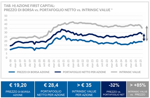 In sintesi, FIRST CAPITAL continua a trattare con uno sconto significativo rispetto al NAV (vedi immagine qui sotto, dati NAV al 30/10), nonostante il portafoglio mostri segnali di tenuta e, in alcuni casi, di rafforzamento.