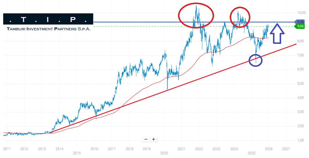 In caso di superamento di quota € 9,4, il titolo potrebbe testare i massimi storici precedenti (area cerchiata in rosso). In sintesi, l’azione sembra ben impostata, senza eccessi e con un profilo tecnico coerente con un investitore paziente.