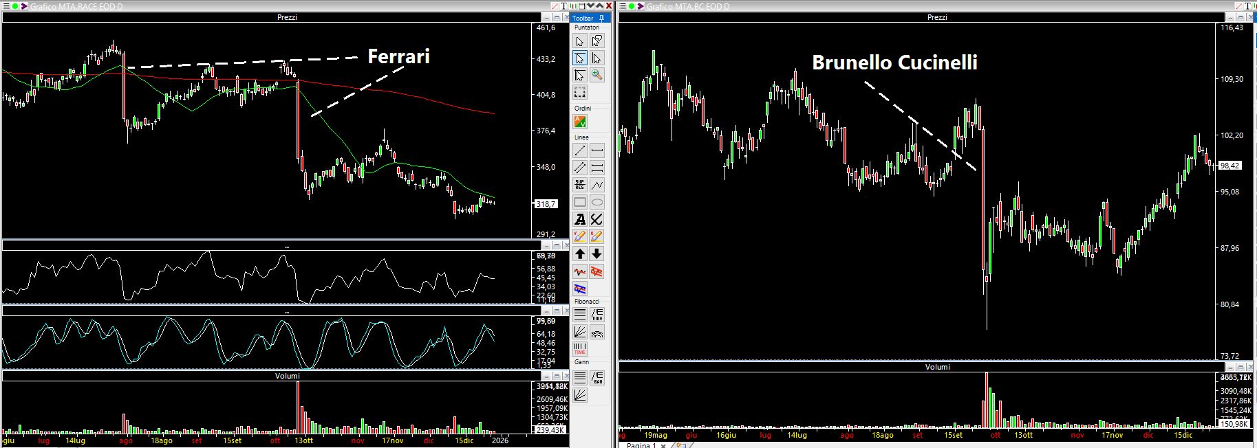 Di seguito i grafici di Ferrari e di Brunello Cucinelli citati precedentemente con i relativi cali a doppia cifra non decimale.