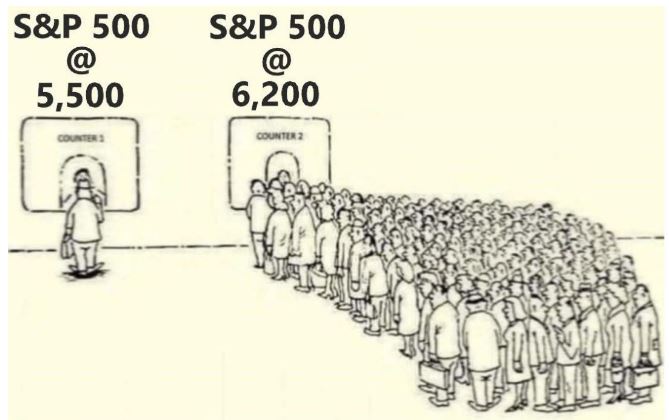 Nel grafico di sopra le cose non sono andate poi così male seppur in modo meno preciso degli scorsi anni. Per prima cosa questa "previsione" è sempre stata una sorta di road map utile in termini di timing (quando) piuttosto che in termini di momentum o di forza/intensità di movimento (quanto). La più grande buy opportunity è stata quella di fine Marzo con "sbavatura" sulla prima settimana di aprile a seguito del Liberation Day di Trump. Immagino lo ricordiate bene. Avevo pubblicato anche una vignetta eloquente: a 6200 punti di S&P500 tutti in coda ad acquistare mentre a 5500 punti di S&P500 nessuno comprava (link articolo: https://www.lombardreport.com/2025/4/5/dow-jones-indici-ftsemib40/). Ebbene quel minimo di mercato lo abbiamo preso, chi nell'intraday e chi per il medio termine. Certamente non è stato facile psicologicamente ma se rileggete l'articolo ne avevo spiegate le motivazioni alla base del mio ottimismo.