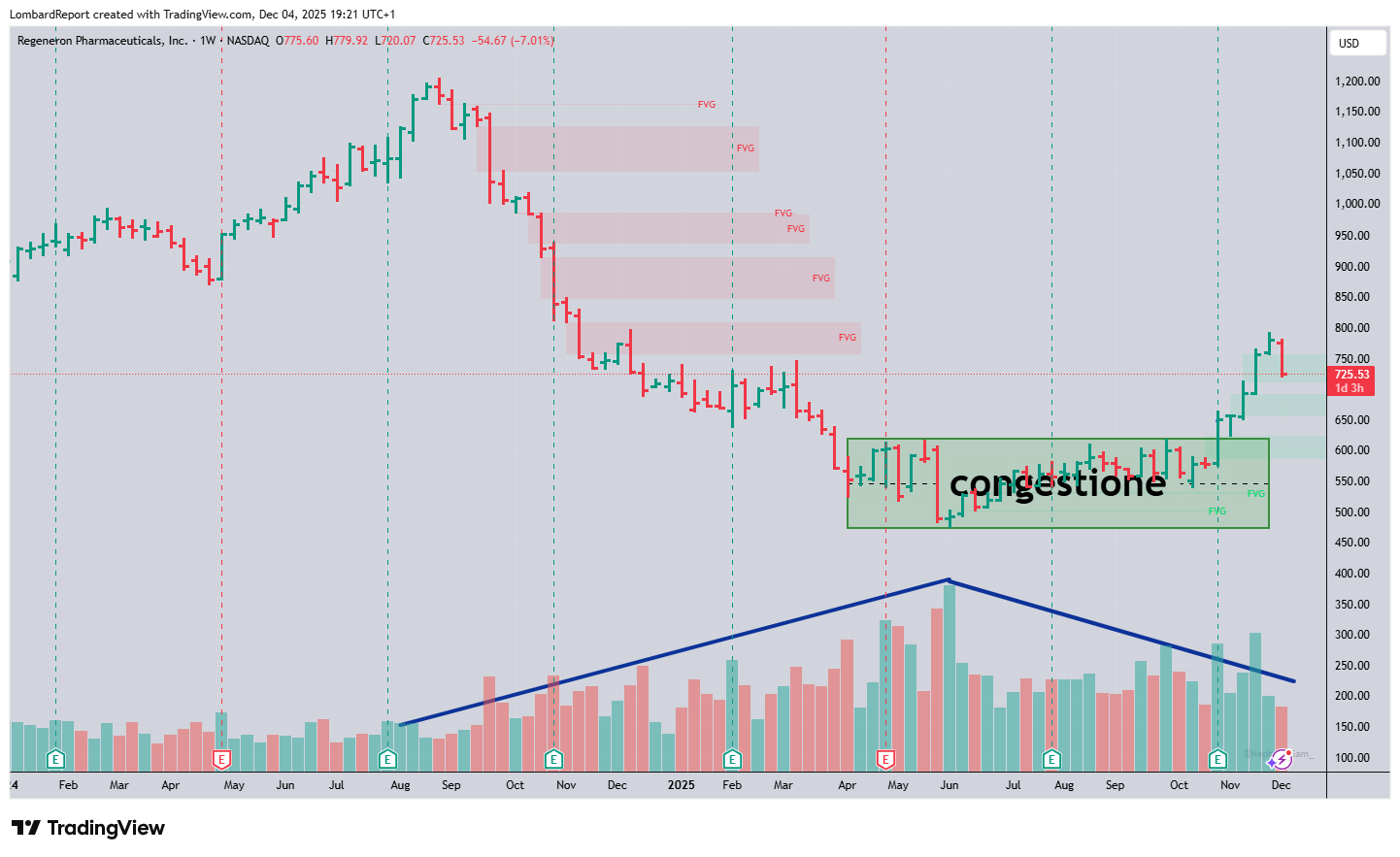 REGENERON: l’avevamo segnalata illo tempore come in fase di bottom up e si è manifestato con una sparata al rialzo. Ora sta ritracciando ed è arrivato il momento per comprarla. Attendiamo che i compratori finalmente si riaffaccino durante il ritracciamento.