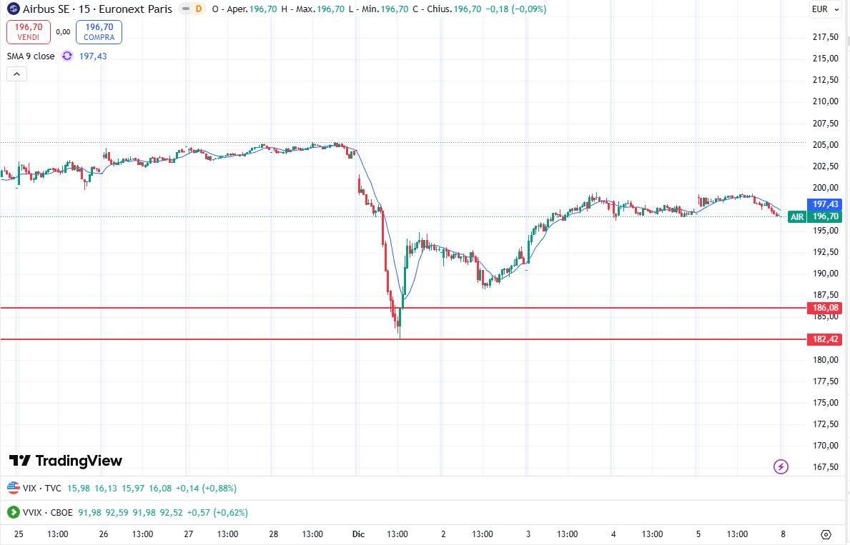 La settimana scorsa siamo andati in Francia in seguito alla notizia delle problematiche derivanti dai raggi solari causate ai software di Airbus. ll potenziale falling knife (coltello cadente, ndr) era collocabile tra 180 e 186 euro (link articolo: https://www.lombardreport.com/2025/11/29/azioni-airbus/). Questa l'anatomia del trade sul 15 minuti: rottura dei 186 euro con minimo a 182,42 euro, candela verde rialzista a 15 minuti che squeeza gli ultimi shortisti (l'atr delle barre si era già ridotto), recupero veloce di 193-195 euro e close weekly@196,70 euro. Cosa fatta capo A diceva il mio capo in banca. Se in intraday o in multiday poco importa. Bye bye!