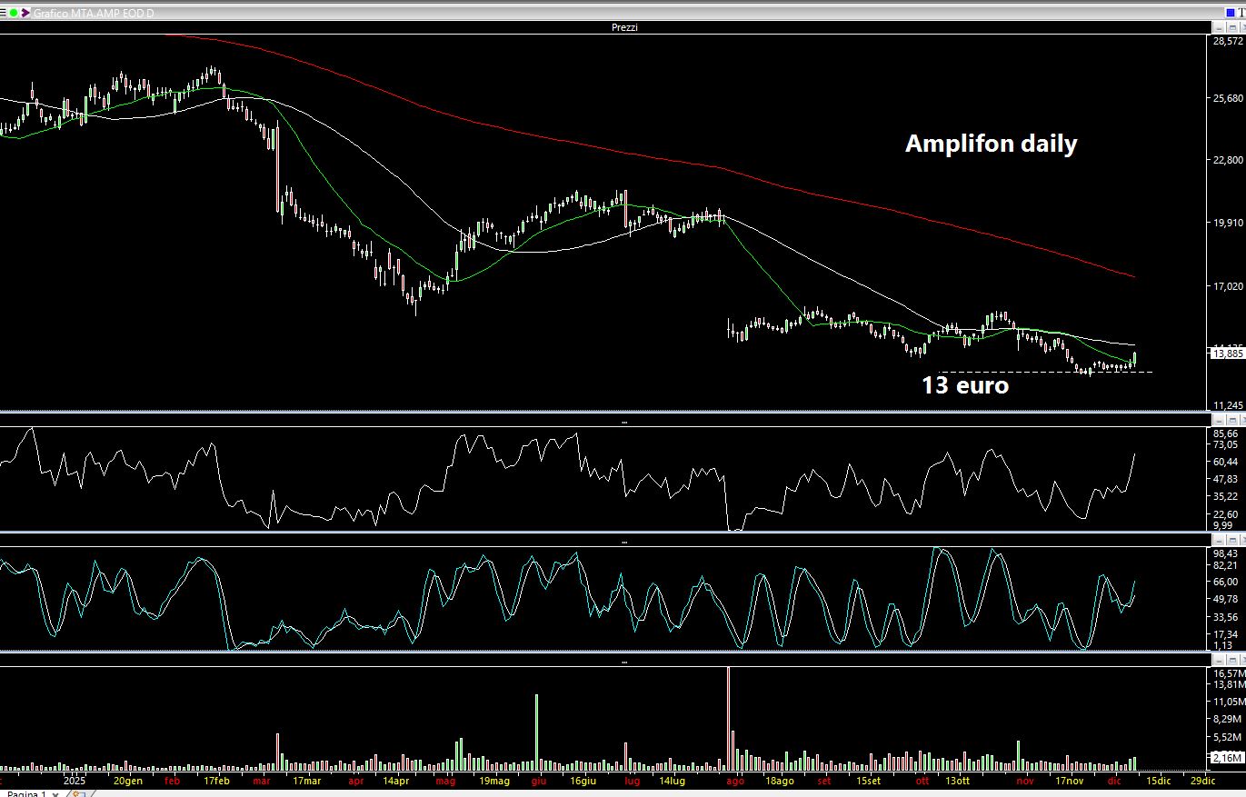 Tentativo di recupero, almeno finché rimarrà sopra 13,00-13,30 euro. E' stata fatta un pò di base e potrebbe recuperare ancora qualche punto percentuale. Close settimanale a 13,885.