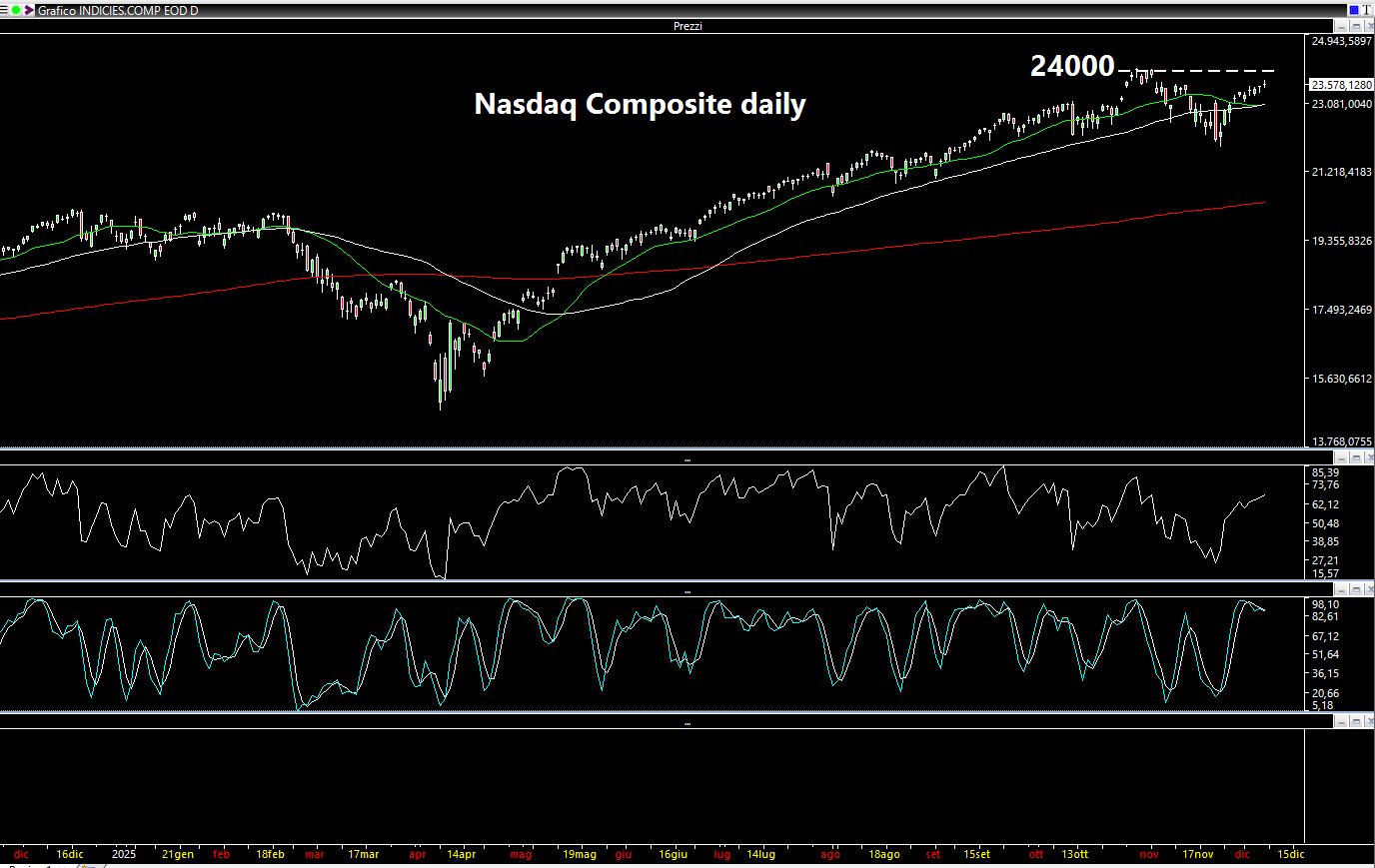 Decisamente più choppy e laterale dei mercati statunitensi. Possibile un ritorno verso i 24500. Al momento siamo sostenuti dai una trendline dinamica ascendente di breve periodo.