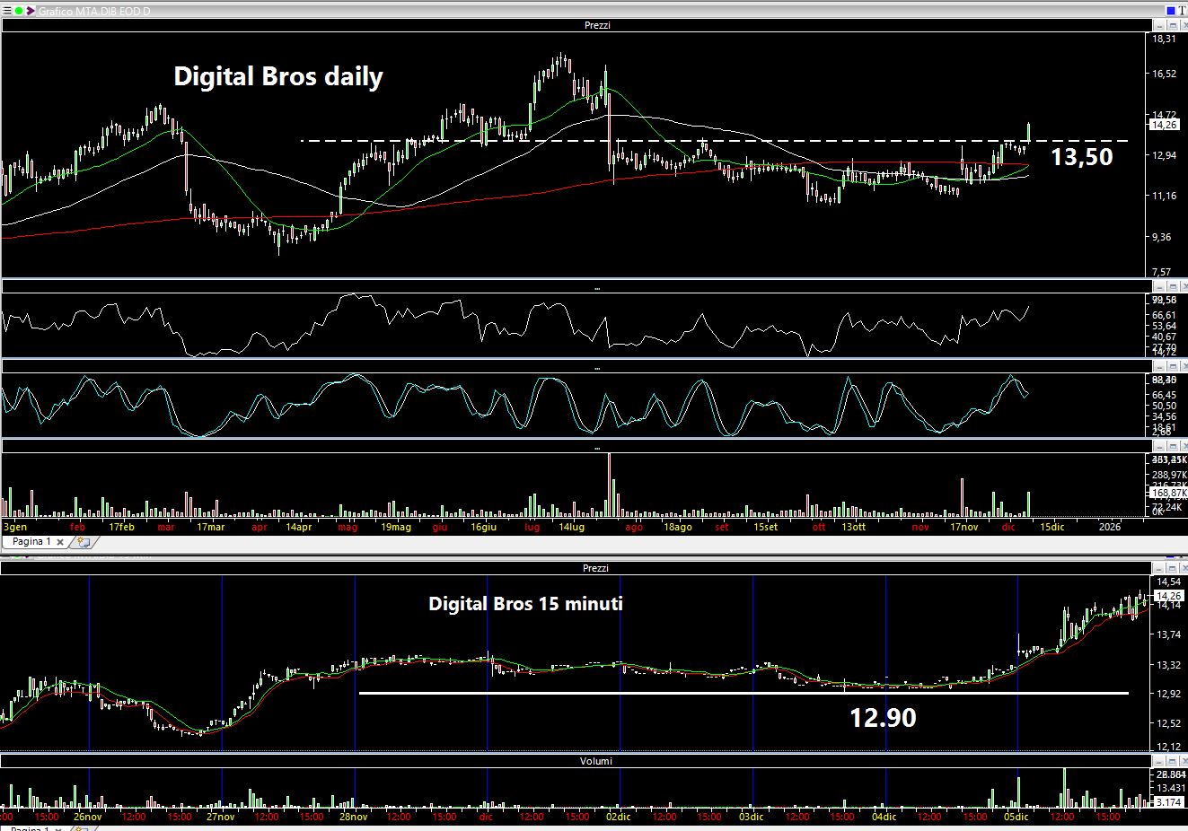 Sta tentando di uscire dalla forte resistenza a 13,50 euro con un close di venerdì a 14,26 euro e buoni volumi continuativi sul 15 minuti. E' una azione "balorda" nel senso che la mano che acquista un giorno si revoca in quello successivo e considerata l'illiquidità generale di Borsa Italiana (i primi dieci titoli arrivano a scambiare quasi il 50-60% dell'intero controvalore prima degli incroci finali) ecco che i titoli del segmento Midcap sono lasciati nel dimenticatoio. Detto questo e preparandosi a possibili spike al ribasso, non mi dispiace affatto la configurazione in corso, almeno fino a quando si manterrà sopra i 12,90-13 euro.