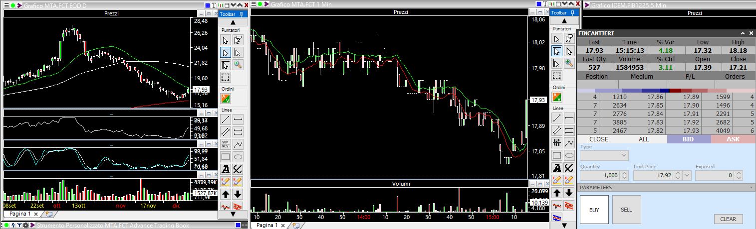 Detto questo, faccio vedere appunto l'aggiotaggio del quotatore: una operazione simulata e fuorviante graficamente e anche da book ma che proprio per questo può essere sfruttata da un trader in carne ed ossa. Osservate nell'immagine successiva come sia sul grafico daily (a sinistra) che su quello a un minuto l'ultimo prezzo visibile sul grafico è 17,93 euro. Questo lo si vede chiaramente sul book in alto a sinistra: ultimo prezzo battuto (last) 17.93 euro....però curiosamente la prima lettera sul primo livello di book è 17.89 euro e tutti i livelli in bid/ask sono pieni di proposte (fittizie) alcune delle quali precedono l'operatore. Insomma, talvolta mi domando come sia possibile che il sottoscritto noti queste inefficienze truffaldine e che nessuno intervenga per proibirle definitivamente. Basterebbe una bella Tobin Tax su tutti gli ordini immessi e revocati valida per QUALUNQUE operatore (market maker compresi, visto che nessuno dovrebbe essere al di sopra delle regole, ma evidentemente la legge non è mai uguale per tutti). Per fortuna però nessuno vuole realmente tutelare chi investe sul mercato che in questo modo prende fischi per fiaschi.