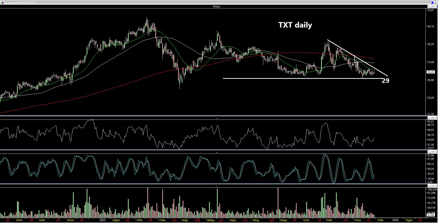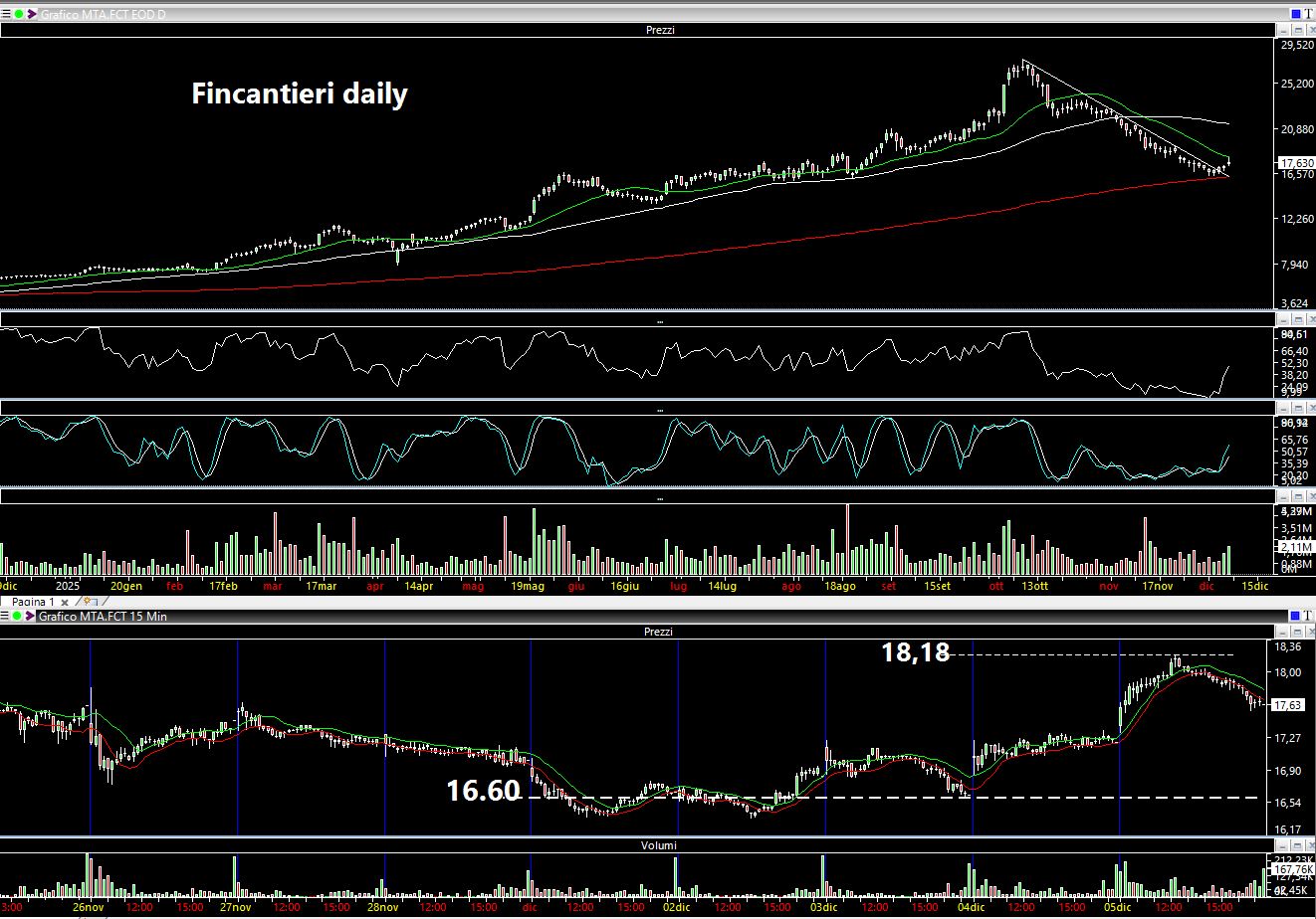 Da avere in book, non fosse altro che alla prossima revisione del paniere entrerà nel FTSEMIB40 al posto di Interpump. Fincantieri è uno dei principali produttori europei di navi militari, incluse fregate, pattugliatori, sottomarini (insieme ad aziende partner) e come tutti i titoli della difesa è stata oggetto di un forte rialzo che nelle ultime settimane è via via scemato. Nel corso del 2025 è passata da 7 euro a oltre 25 euro, ma negli ultimi due mesi da 25 euro si è passati a 17,50 circa: un ribasso del 30% circa. Graficamente ha testato la media rossa a 200 giorni ma ha incontrato un tappo su quella a 20 di colore verde. Positiva la rottura della trendline dinamica discendente che potrebbe indicare una possibile riduzione della pressione ribassista di breve periodo almeno finché rimarrà sopra 16,60 euro rispetto ai 17,63 di chiusura di venerdì. Al momento non ho alcun livello grafico/operativo ma la seguirò a prescindere per le motivazioni di cui sopra. Di seguito il grafico daily e quello a 15 minuti.