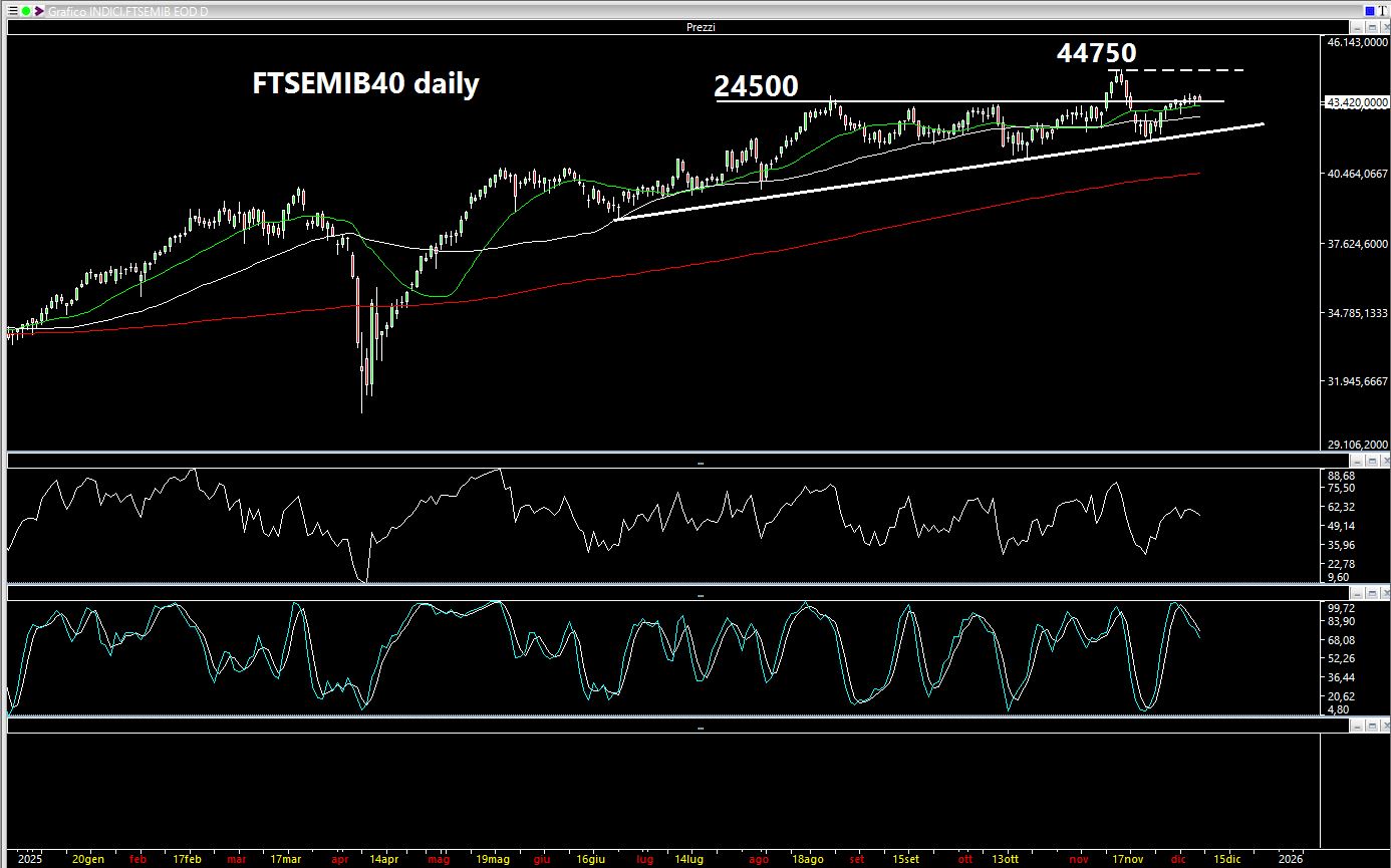 Pare sia messo meglio del Dax essendosi riportato in area 43400-43500 punti. Se riuscirà a consolidare in questa zona il livello successivo è a 44750 punti (linea tratteggiata).
