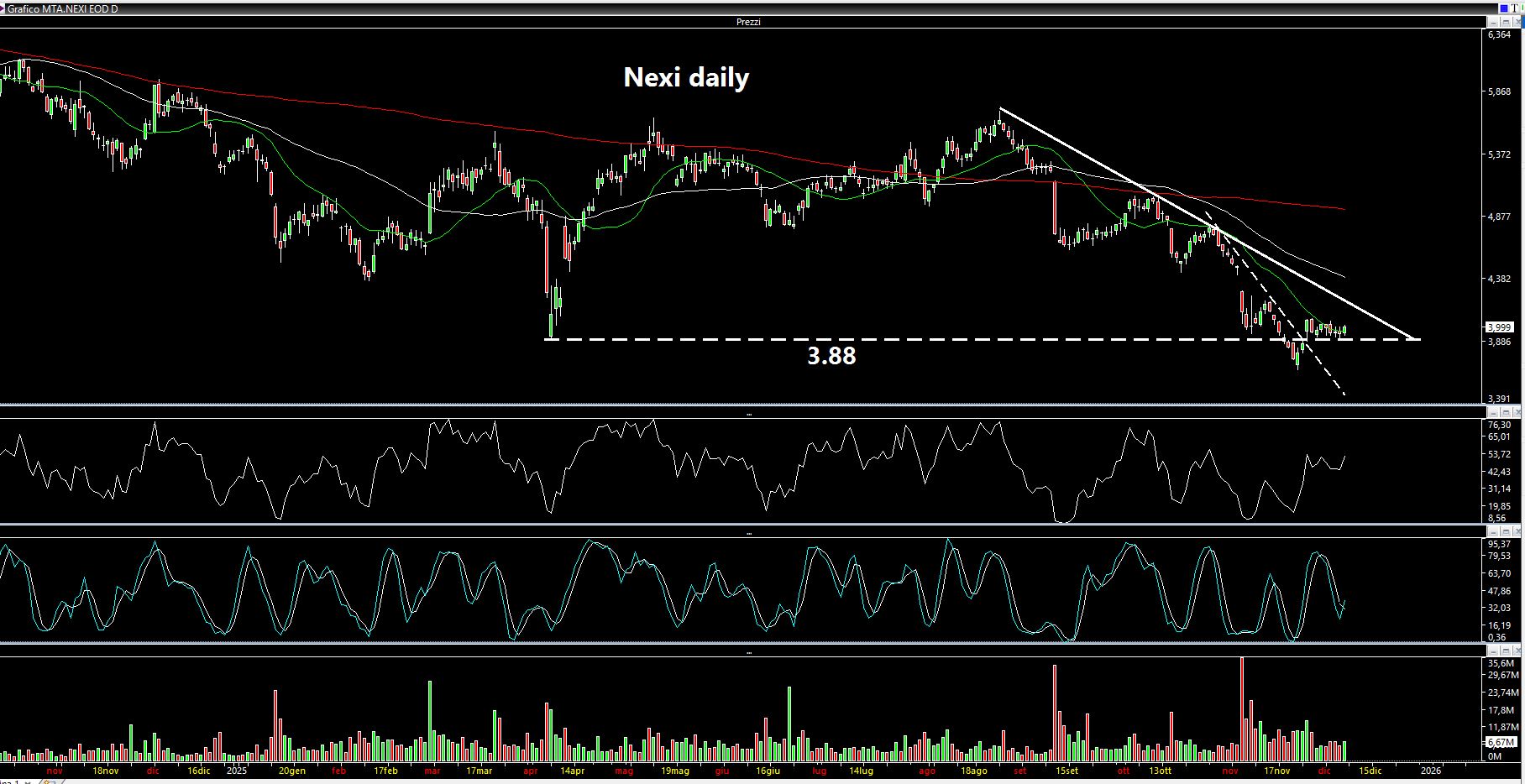 La strega di questo 2025 è certamente Nexi passata da 5,40 euro di inizio anno ai 4 attuali. Il grafico rimane dunque osceno. Detto questo nelle ultime due settimane sta cercando di formare una base tra 3,88 e 4,06 a ridosso della media a 20 periodi di colore verde. La parte bassa a 3.88 coincide con vecchi minimi toccati ad aprile di quest'anno in occasione del Liberation day. Potrebbe esserci stato un falso breakout di 3.88 subito rientrato dove i vecchi long si sono stoppati. Non mi aspetto alcun rally ma forse un pò di recupero. In ogni caso stop sotto 3.80 dai 4 euro di chiusura di venerdì.