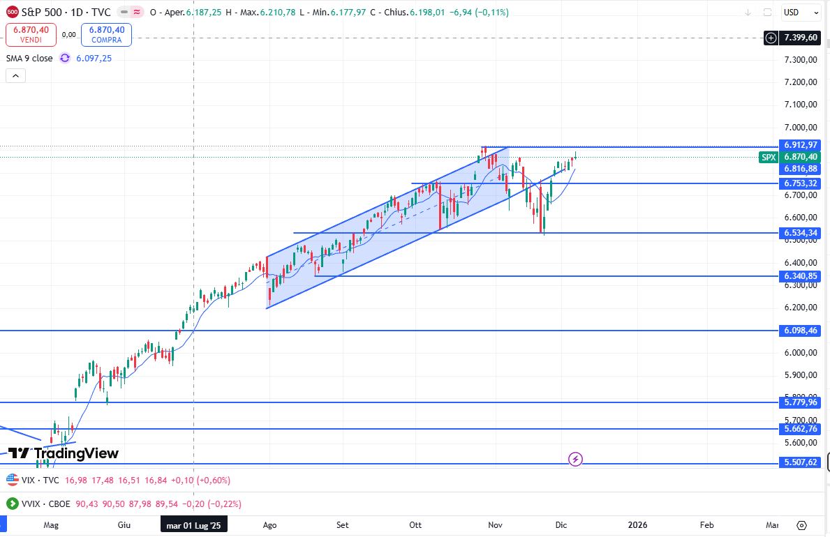 Ricordate la famosa barra ribassista di un paio di settimane fa? Era una candela "che comanda" come dico io. Sopra un possibile scenario e sotto un altro. A ieri siamo a ridosso dei massimi storici. Personalmente ho deciso di non cavalcare eventuali allunghi di indice. E' una questione di feeling, di pelle...e non mi stupirebbe un aumento di volatilità già a gennaio. Staremo a vedere. Per il momento finché rimaniamo sopra i 6750 lo scenario è orientato al sereno o comunque ad un possibile trading range.