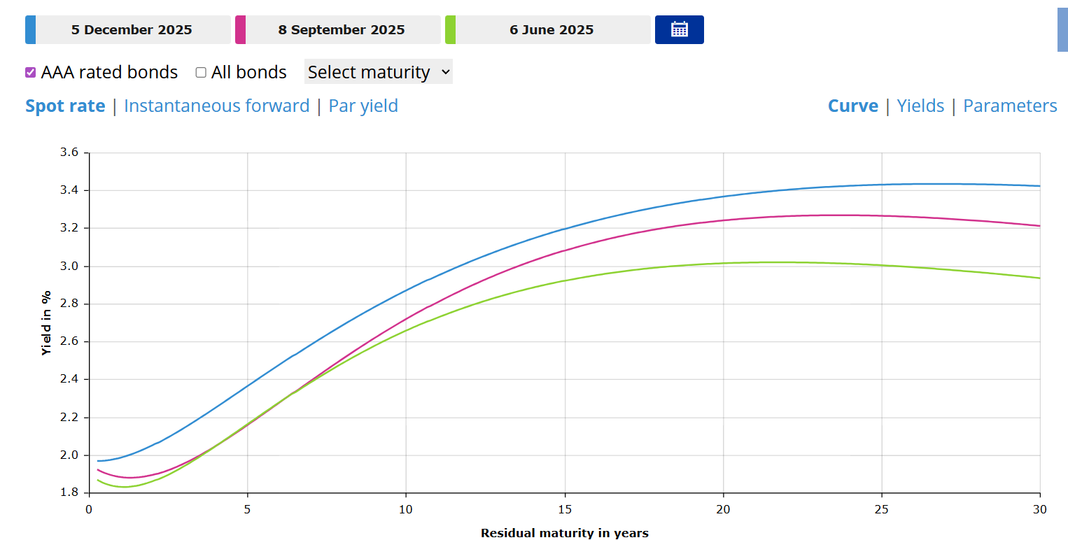 L’ultimo taglio ai tassi da parte della BCE (torniamo pure “istituzionali”) risale a giugno : da quel momento, visto che le obbligazioni sono sempre, come già ricordato, un esercizio di matematica, le uniche oscillazioni che avremmo dovuto vedere avrebbero potuto avere a che fare solo con notizie di vario genere (vedi lo shock dei dazi USA). Anzi, forse a causa di dati che potenzialmente potevano creare ancora qualche timore inflattivo e lavorativo, le maggiori oscillazioni sarebbe stato anche sensato vederle nella parte più vicina della ZC-Yeld Curve. Invece, da allora, complice forse l’assenza di dati causa shutdown, abbiamo visto ampliarsi la forbice sul decennale (uno 0,20% abbondante) ma soprattutto sul trentennale dove siamo passati dal 2,93% di giugno al 3,42% di dicembre : mezzo punto in sei mesi !! Qui sotto, ad ogni buon conto, il grafico che ognuno di voi può comodamente estrapolare con le proprie preferenze direttamente dal sito della BCE (www.ecb.europa.eu) nella sezione relativa alle statistiche. Da una curva con gradiente positivo nel breve-medio periodo che si appiattisce e poi degrada con il passare del tempo (quella di giugno), ci troviamo ad una curva che allunga la sua corsa per appiattirsi sulla scadenza più lunga (quella di dicembre). No good … almeno così, a prima vista; perché sebbene nessuno sia in grado di prevedere il futuro, una foto del genere parrebbe avere una duplice chiave di lettura : o si crede ad un futuro in cui l’inflazione possa avere ancora una valenza significativa, oppure - cosa ancora più seria – si crede che il debito possa iniziare a diventare un problema rilevante e allora, per prestare dei soldi, si chiedono maggiori interessi. In ogni caso lo scenario in chiave di lungo periodo appare poco simpatico. La curva poi prosegue con gradiente negativo sulle scadenze extra long, quasi a voler dire che, tutto sommato, sulla duration dei cosiddetti “matusalemme” ci si aspetta di vedere una situazione complessivamente stabile e più in linea con i tassi standard di riferimento (il famoso 2% “ossessione” delle banche centrali di mezzo mondo).