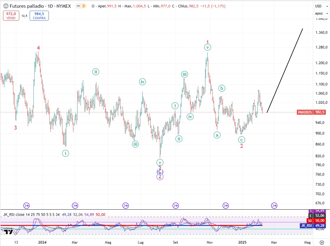 Se quella in corso sul palladio è un’onda terza i prezzi dovranno salire ben oltre il massimo di onda 1. Da seguire.