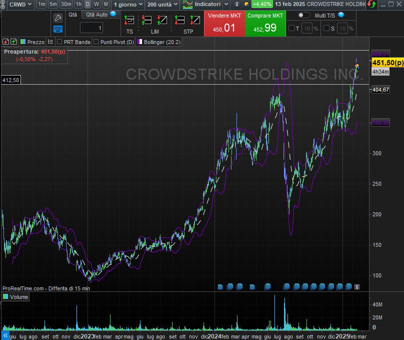 Crowdstrike (CRWD): In rally verso 470, ma un ritracciamento a 411$ (o 367$) offrirebbe entry migliori.