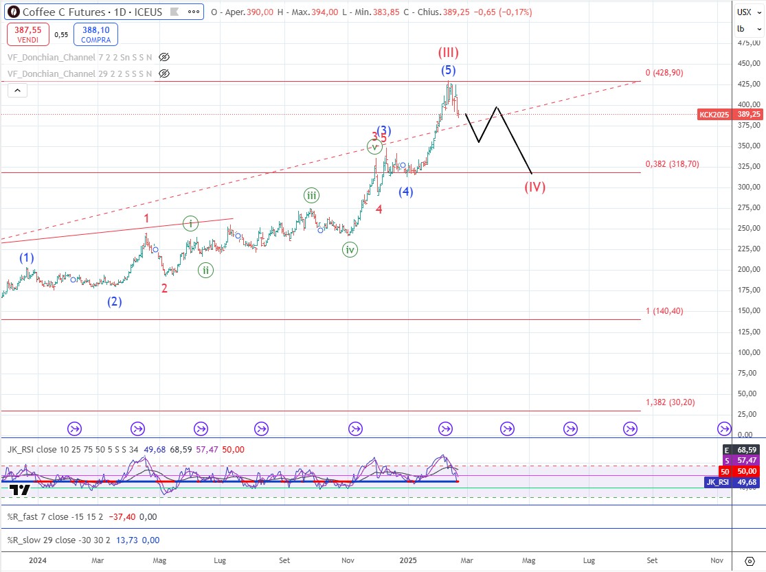 La soia abbozza una sorta di 1-2 ma è presto per dire se l’onda 3 di (5) è in corso ed anche per capire se possiamo considerare valido il conteggio alternativo. Da seguire e poi vediamo dive vuole andare.