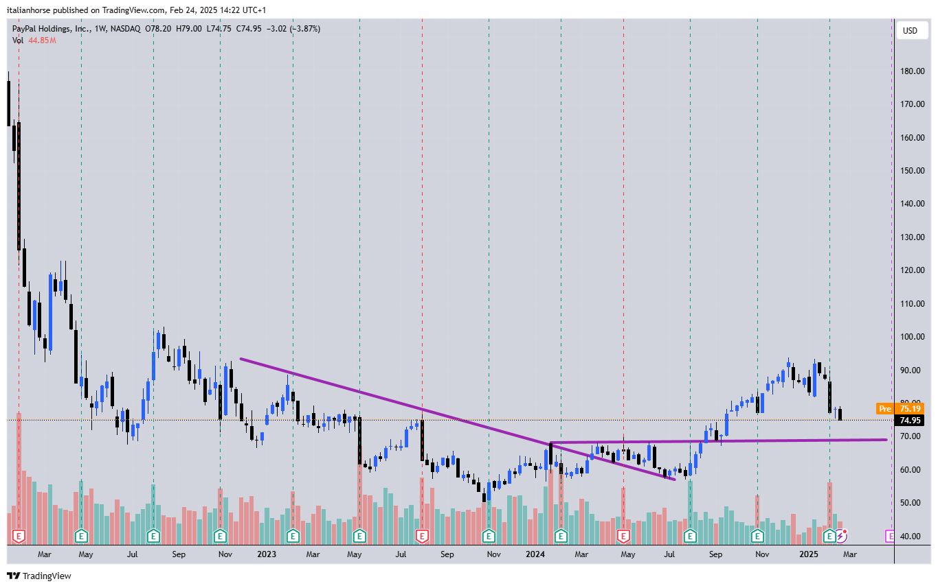 PAYPAL: azione bastonata alla grande che sta cercando di uscire da un bottom di lunga durata. La trendline rialzista sembra bene impostata.