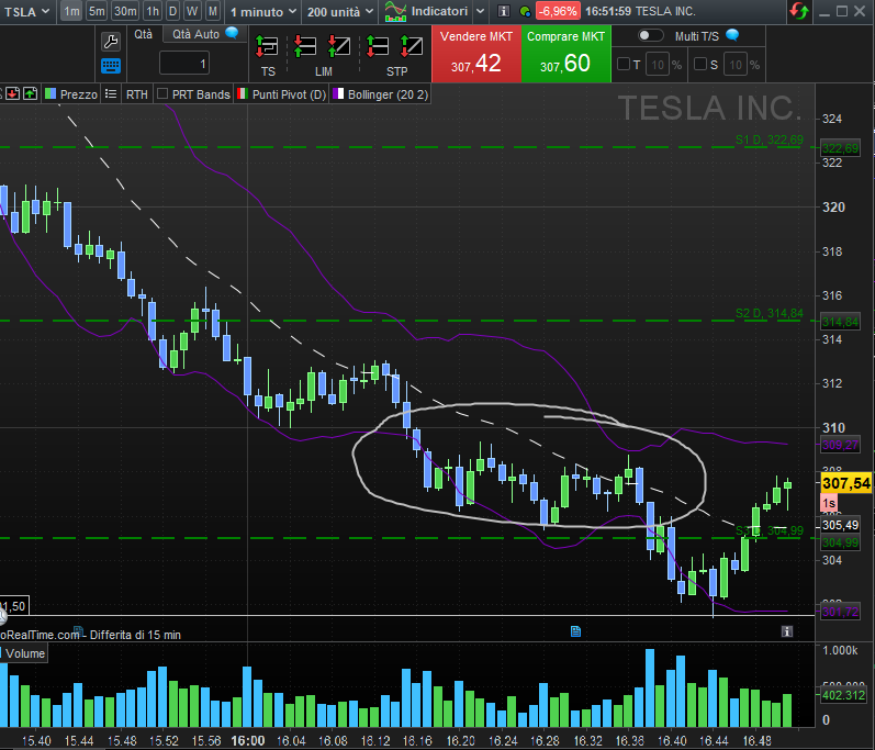 Mentre i mercati navigano in rosso, Tesla regala scampoli di adrenalina: in pochi minuti, il titolo ha impennato +5$ intraday per operazione di scalping veloce, sfruttando il livello di supporto ai 305$ come trampolino, dove era scivolata velocemente in apertura di contrattazioni, come visibile nel grafico ad 1 minuto in basso. Chi non eˋ un trader ultra−veloce (quelli giaˋ usciti dopo i balzi da 305$) può ancora puntare a un rimbalzo verso i 310-314$ solo se i 300$ reggono.