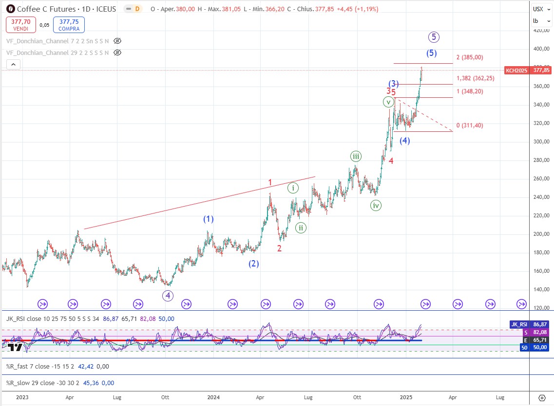 Il caffè si avvicina al target del 200% di onda (4). Vediamo se sale ancora o se ci sarà una correzione.