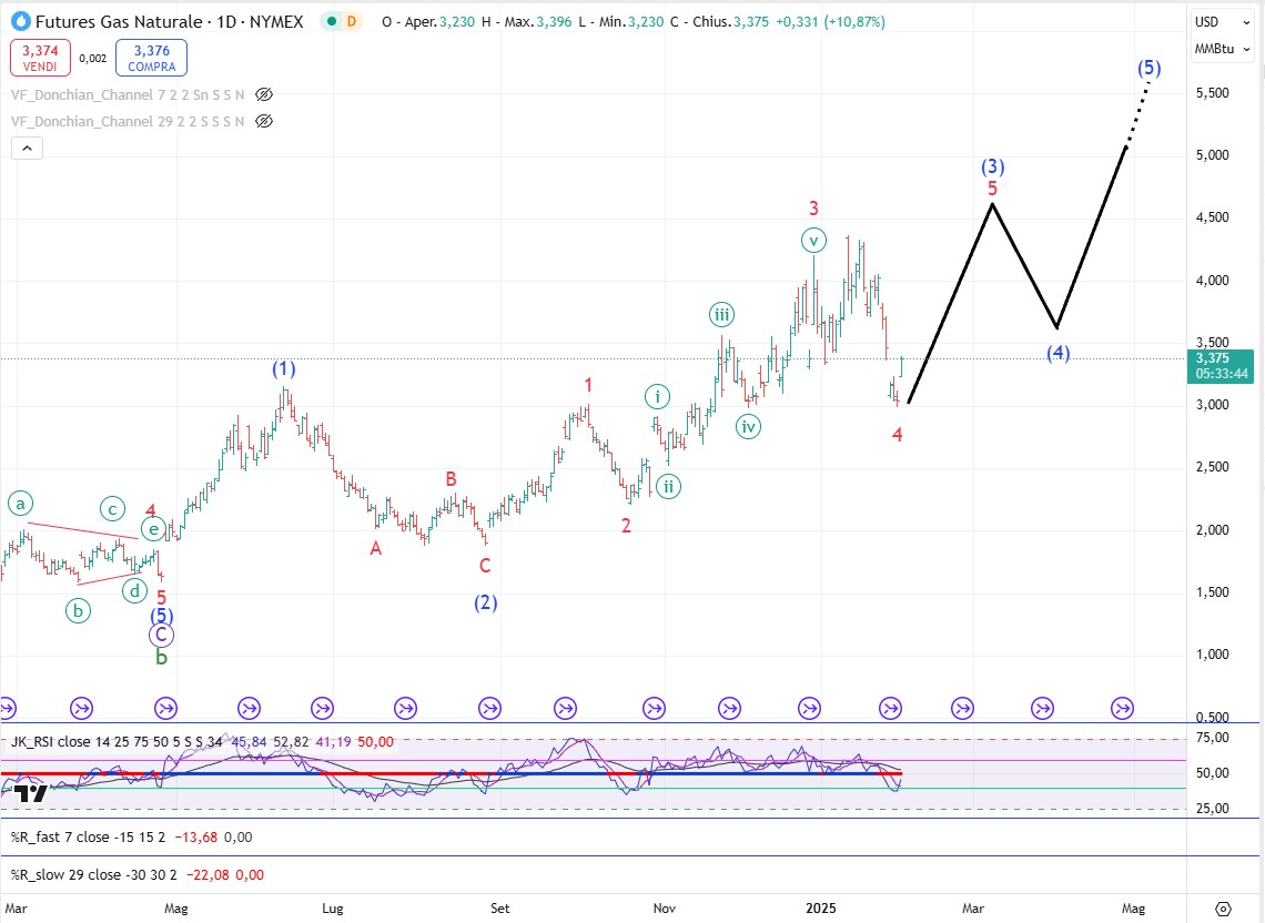 Il gas naturale ha completato o sta completando l’onda 4 di (3). L’onda 5 porterà il gas a nuovi massimi.