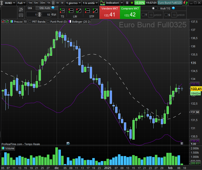 Un altro elemento chiave delle operazioni settimanali è stato il Bund, che ha fornito opportunità strategiche per chi ha saputo gestire il proprio portafoglio con precisione. Il livello dei 130,5 ha rappresentato un punto di ingresso chiave per un disperato tentativo long di mediazione, rivelatosi poi fruttuoso con l’uscita in pari o in leggero gain ai 132 punti e invece in totale gain per la parte residua di portafoglio ai 133 punti.