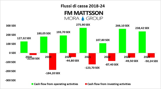 Il calo della marginalità è attribuibile sia alla contrazione delle vendite sia all’incapacità di ridurre i costi operativi in modo proporzionale al rallentamento della domanda. FM Mattsson ha sostenuto 2,4 MSEK di costi una tantum per la riorganizzazione del personale, mentre nel 2023 i costi straordinari erano stati 3,2 MSEK, compensati però da un sussidio energetico di 7,6 MSEK.