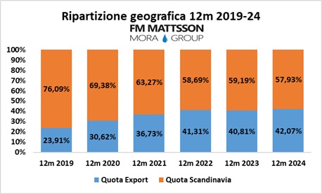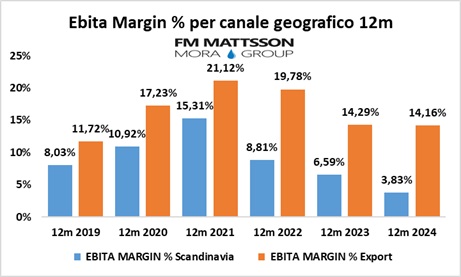 Analizzando la segmentazione geografica, il mercato scandinavo, che rappresenta il 57,9% del fatturato totale, ha registrato un calo del 5,0% su base annua, a causa della debolezza delle nuove costruzioni e delle ristrutturazioni private. Al contrario, il segmento internazionale, che pesa per il 42,1%, ha tenuto meglio, grazie soprattutto alla crescita nei mercati del Regno Unito e dell’Irlanda. La quota export, dal 2019 al 2024 è quasi raddoppiata.